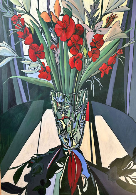 In Liza Krügermeier's flower series, it is the interaction between light and shadow and the sculptural forms that are of interest to her. Often, the motif is from the artist's own home where the 100 year old dining table makes the foundation for the various still lifes of vases filled with flowers.