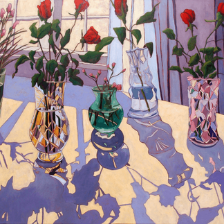 The highly luminous colours Liza Krügermeier might have been absorbed during a five-year stay on the Greek island of Leros. Certainly, you will find the clear and jeweled colours of the Mediterranean region in many of her paintings. The current surroundings of Møn also find their way into her pictures. In ‘All the vases in the Cupboard’ one can see an inspiration from Anna Ancher, who also liked to paint rooms with the sunlight flowing in through the window and with the shadows flickering on the floor and wall. The flower arrangements with their clear colour surfaces, secure composition and great decorative qualities also show a spiritual relationship with Denmark’s supreme best flower painters of all time: Anna Syberg.